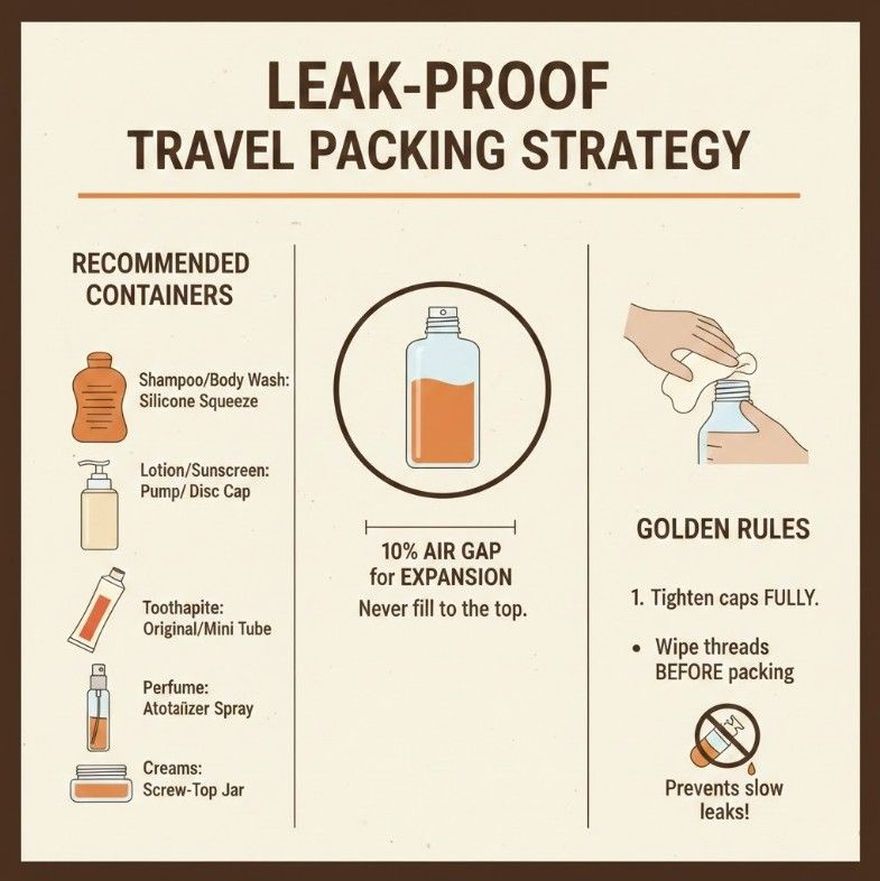 Most travel mess comes from pressure changes, loose caps, poor material choices, or overpacking. Liquids expand slightly in airplane cargo holds or even during temperature shifts in cars.